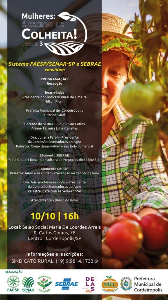 Em mais uma importante ação, o programa “Mulheres: É Tempo de Colheita!” chega nesta sexta-feira (10/10), à cidade de Cordeirópolis. A iniciativa é da Comissão Semeadoras do Agro, da Federação da Agricultura e Pecuária do Estado de São Paulo (Faesp), em parceria com o Sebrae DELAS, Sindicatos Rurais, prefeituras e entidades locais, e encerra o ciclo de capacitação e fomento a novas lideranças femininas no agro paulista.