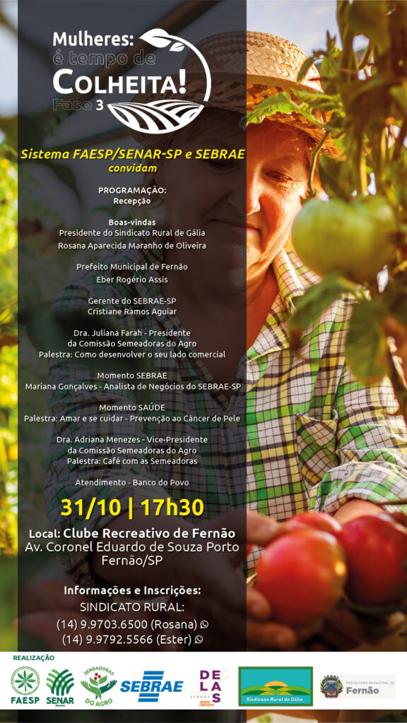 Em mais uma importante ação, o programa “Mulheres: É Tempo de Colheita!” chega nesta sexta-feira (31/10), à cidade de Fernão. A iniciativa é da Comissão Semeadoras do Agro, da Federação da Agricultura e Pecuária do Estado de São Paulo (Faesp), em parceria com o Sebrae DELAS, Sindicatos Rurais, prefeituras e entidades locais, e encerra o ciclo de capacitação e fomento a novas lideranças femininas no agro paulista.