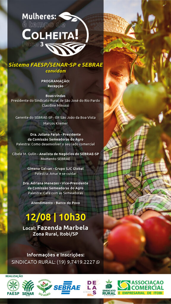Em mais uma importante ação, o programa “Mulheres: É Tempo de Colheita!” chega nesta terça-feira (12/08), à cidade de Itobi. A iniciativa é da Comissão Semeadoras do Agro, da Federação da Agricultura e Pecuária do Estado de São Paulo (Faesp), em parceria com o Sebrae DELAS, Sindicatos Rurais, prefeituras e entidades locais, e encerra o ciclo de capacitação e fomento a novas lideranças femininas no agro paulista.