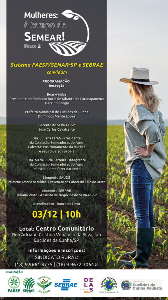 A Federação da Agricultura e Pecuária do Estado de São Paulo (Faesp), em parceria com o Sebrae-SP, tem o prazer de anunciar a chegada do projeto “Mulheres: É Tempo de Semear!” a Euclides da Cunha. O evento ocorrerá nesta quarta-feira (03/12), às 10h, no Centro Comunitário, rua Adriane Cristina Venâncio da Silva, s/n.