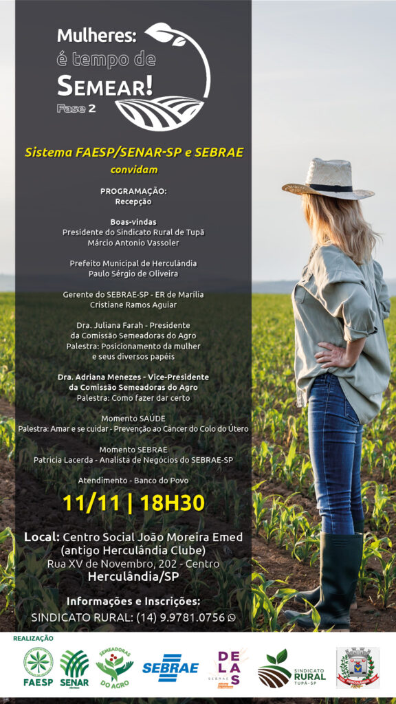 A Federação da Agricultura e Pecuária do Estado de São Paulo (Faesp), em parceria com o Sebrae-SP, tem o prazer de anunciar a chegada do projeto “Mulheres: É Tempo de Semear!” a Herculândia. O evento ocorrerá nesta terça (11/11), às 18h30, no Centro Social João Moreira Emed (antigo Herculândia Clube), rua XV de Novembro, 202, Centro.
