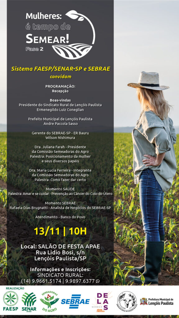 A Federação da Agricultura e Pecuária do Estado de São Paulo (Faesp), em parceria com o Sebrae-SP, tem o prazer de anunciar a chegada do projeto “Mulheres: É Tempo de Semear!” a Lençóis Paulista. O evento ocorrerá nesta quinta-feira (13/11), às 10h, Salão de Festa APAE, rua Lidio Bosi, s/n.