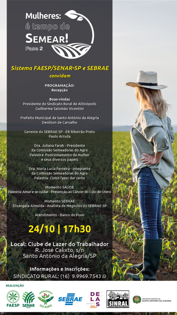 A Federação da Agricultura e Pecuária do Estado de São Paulo (Faesp), em parceria com o Sebrae-SP, tem o prazer de anunciar a chegada do projeto “Mulheres: É Tempo de Semear!” a Santo Antônio da Alegria. O evento ocorrerá nesta sexta (17/10), às 17h30, no Clube de Lazer do Trabalhador, rua José Calixto, s/n.