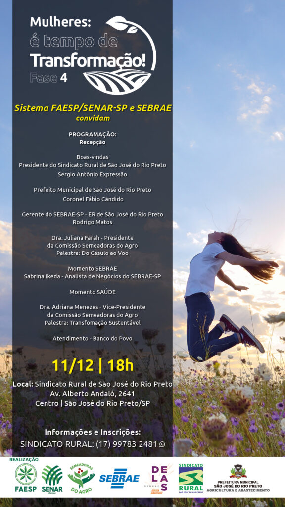 Em mais uma importante ação, o programa “Mulheres: É Tempo de Transformação!” chega nesta quinta-feira (11/12), à cidade de São José do Rio Preto. A iniciativa é da Comissão Semeadoras do Agro, da Federação da Agricultura e Pecuária do Estado de São Paulo (Faesp), em parceria com o Sebrae DELAS, Sindicatos Rurais, prefeituras e entidades locais, e encerra o ciclo de capacitação e fomento a novas lideranças femininas no agro paulista.