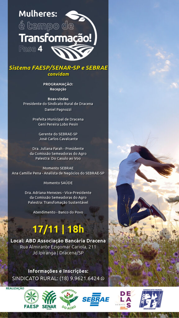 Em mais uma importante ação, o programa “Mulheres: É Tempo de Transformação!” chega nesta segunda-feira (17/11), à cidade de Dracena. A iniciativa é da Comissão Semeadoras do Agro, da Federação da Agricultura e Pecuária do Estado de São Paulo (Faesp), em parceria com o Sebrae DELAS, Sindicatos Rurais, prefeituras e entidades locais, e encerra o ciclo de capacitação e fomento a novas lideranças femininas no agro paulista.