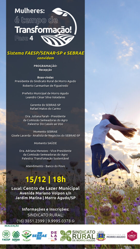 Em mais uma importante ação, o programa “Mulheres: É Tempo de Transformação!” chega nesta segunda (15/12), à cidade de Morro Agudo. A iniciativa é da Comissão Semeadoras do Agro, da Federação da Agricultura e Pecuária do Estado de São Paulo (Faesp), em parceria com o Sebrae DELAS, Sindicatos Rurais, prefeituras e entidades locais, e encerra o ciclo de capacitação e fomento a novas lideranças femininas no agro paulista.