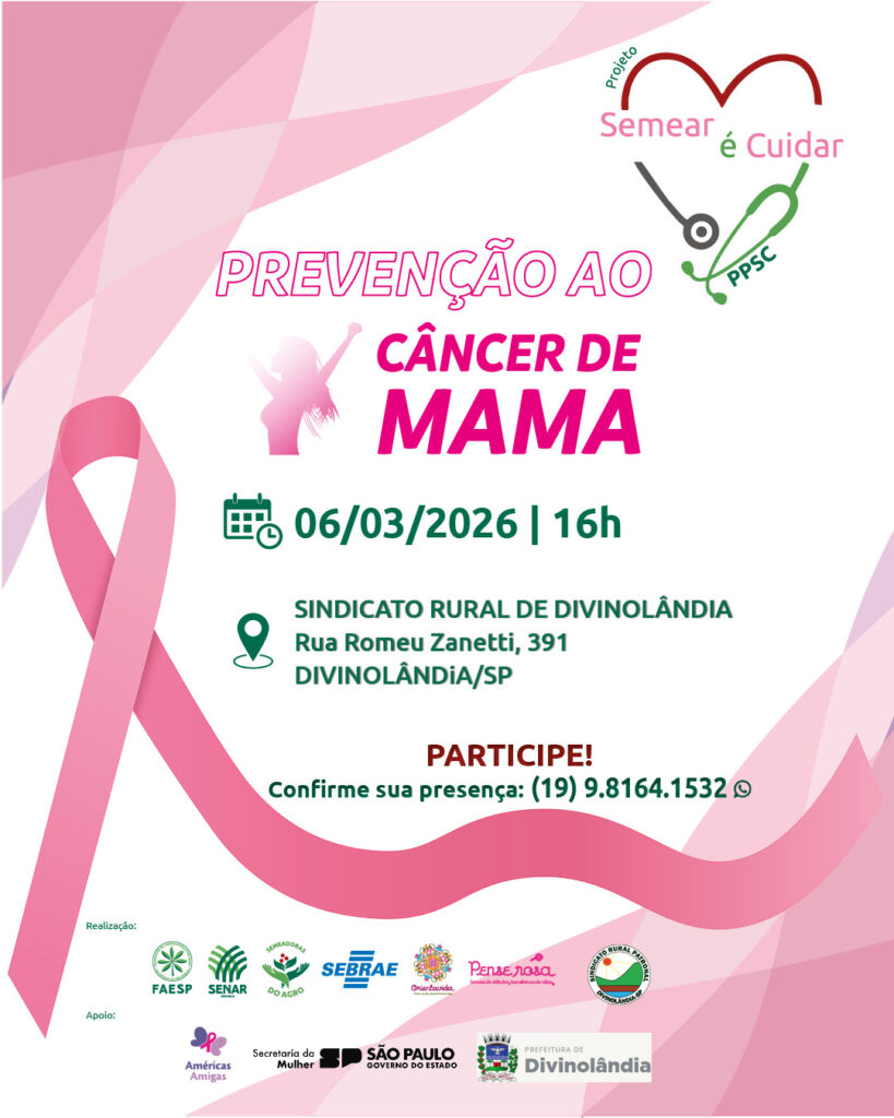 O projeto “Semear é Cuidar” será lançado na sexta-feira (06/03), na cidade de Divinolândia. A iniciativa é uma extensão do Programa Promovendo Saúde no Campo (PPSC/Senar-SP), realizado pela Comissão Semeadoras do Agro, da Federação da Agricultura e Pecuária do Estado de São Paulo (Faesp), em parceria com o Sindicato Rural da cidade, a ONG Orientavida e com o Governo do Estado de São Paulo.